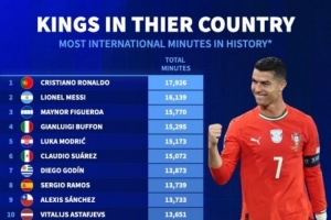 国家队出场时间排名:C罗、梅西前两名,布冯第四、莫德里奇第五