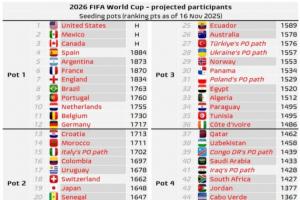 体育资讯11月17日讯 世预赛激战正酣,目前世界杯48支参赛队已确定32席,数据机构Football Meets Data给出了最新的世界杯分档预测。
