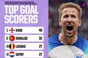 体育资讯11月17日讯 Opta统计了球员在近4届欧洲杯预选赛、世预赛欧洲区比赛的进球数量,并列出榜单,凯恩40球居首。