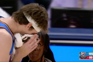 看着挺疼!卡尔森补篮被米西犯规 血洒赛场