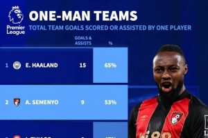 依赖!哈兰德参与全队65%进球英超居首,塞梅尼奥53%次席