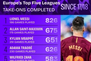 17-18赛季至今五大联赛成功过人榜:梅西826次居首,圣马第二