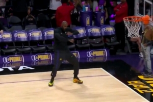 詹姆斯赛前天勾命中 原地扭动跳起摇手舞