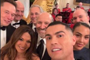 该图为C罗拿着手机自拍的视角,图中包括乔治娜、马斯克、因凡蒂诺等人。之后马斯克还在该推特下评论。