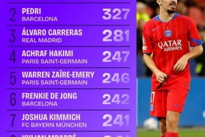 345次!维蒂尼亚的进攻三区完成传球次数位列五大联赛第一