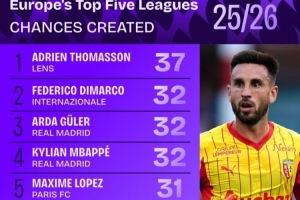 五大联赛创造机会榜:迪马尔科、居勒尔列二三,姆巴佩、B费在列
