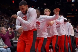 词穷了!猛龙赛前仪式:排长龙热身 坦普尔突然疯狂舞动