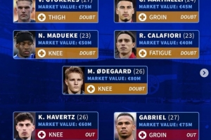 德转列阿森纳伤病名单:加布里埃尔等3人伤缺,约克雷斯等5将存疑