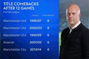 第12轮落后榜首6分或更多最终夺冠,英超历史仅出现5次