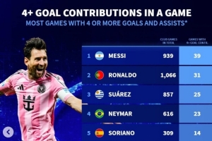 俱乐部单场参与进球4+榜:梅西39次、C罗31次 苏牙内马尔分列三四