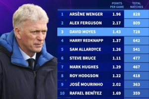 英超主帅执教场次排名:莫耶斯728场第三,有望追上弗爵爷和温格