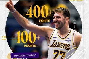 卢卡开季12场得分400+助攻100+历史首人!湖人官方:历史最佳开局