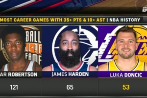 东契奇生涯已53次至少35分10助 历史第三&哈登65次第二