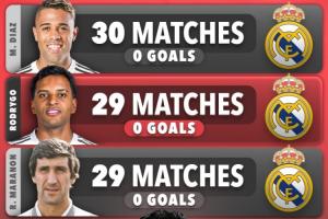 身价8000万24岁罗德里戈29场球荒皇马队史第2,差1场平纪录