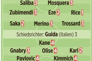图片报评分:诺伊尔、于帕、莱默尔5分最差 赖斯1分最佳、卡尔2分