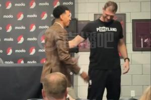 小吧直击开拓者赛前发布会 斯普利特与丹尼·格林老友相见抱一抱~