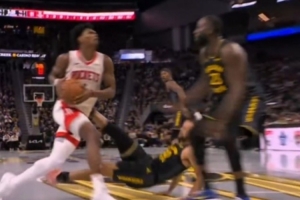 阿门撞倒库里&后者阻挡犯规!美勇蜜:库里受伤了 阿门真烦人