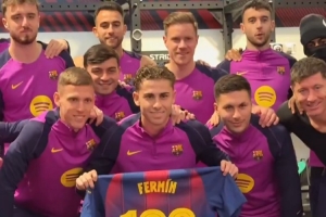恭喜!22岁费尔明获巴萨一线队生涯百场纪念球衣,队友簇拥祝贺