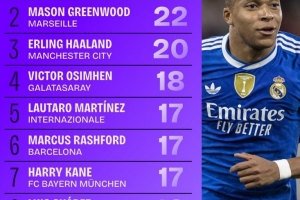 本赛季欧冠射门次数榜:姆巴佩居首,格林伍德次席,哈兰德第三