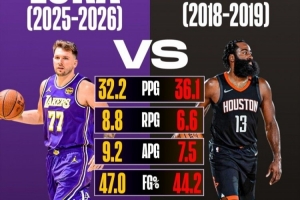 东契奇本季场均35.2分8.8板9.2助 18-19哈登场均36.1分6.6板7.5助