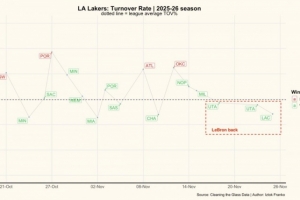 备注:虚线为联盟平均线,绿色为赢球比赛失误率,红色为输球比赛失误率