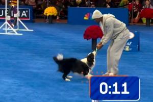 马克西参加小狗竞赛边牧半路咬住了他手里的玩具