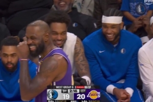 这说啥了?詹姆斯在场上和替补席的欧文聊天 直接笑出表情包