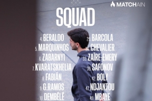 前锋:7-克瓦拉茨赫利亚、9-贡萨洛·拉莫斯、10-登贝莱、19-李刚仁、29-巴尔科拉、47-恩贾恩图、49-姆巴耶