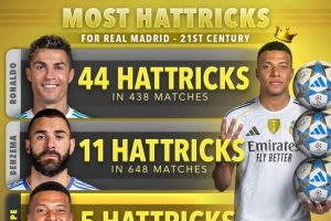 本世纪皇马戴帽次数榜:C罗44次居首,本泽马11次、姆巴佩5次