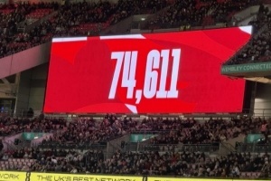 本场比赛热度火爆,比赛结束前,现场公布的到场观众人数达到74611人,堪比一场正式大赛对决。
