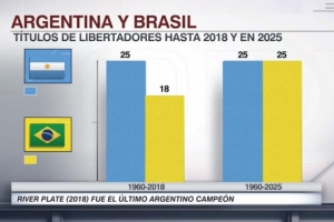 据ESPN统计,截至2018年阿根廷球队25次夺得南美解放者杯冠军,巴西球队18次夺冠。