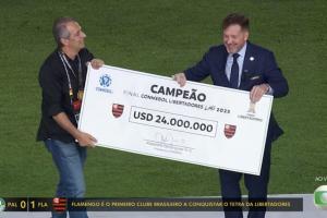 现场给钱弗拉门戈夺解放者杯,颁奖典礼上获颁2400万美元支票