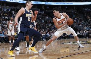 看着都疼!布克突破肘到约基奇下巴 后者痛苦倒地