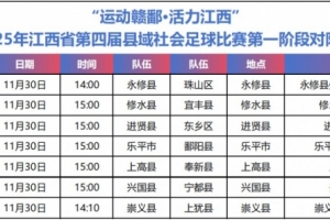体育资讯11月30日讯 据江西省足球协会官方报道,今日2025年江西省第四届县域社会足球(简称“江西县超”)比赛正式打响,今日将进行7场比赛,其余14场比赛也将陆续打响。