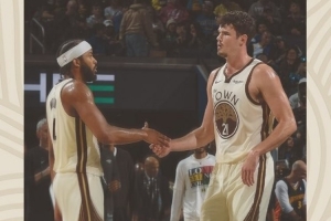 勇士发布赢球海报:封面为穆迪和波斯特握手庆祝瞬间