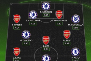 Whoscored列本赛季英超枪手+蓝军评分最高阵:凯塞多、赖斯领衔