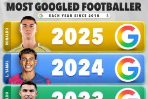 近15年谷歌搜索量最高球员榜:C罗10次第一霸榜,梅西22年登顶