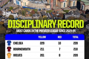 自23/24赛季英超吃牌榜:切尔西229黄10红,两项数据均为最多