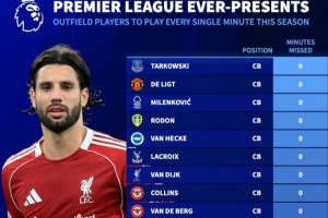 本赛季英超全勤非门将共16人:德里赫特、范戴克、索博、扎卡在列