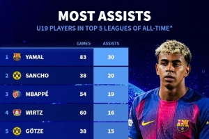 五大联赛历史U19球员助攻榜:亚马尔30助最多,桑乔20助次席