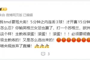 “我tmd要骂大街!5分钟之内连丢3球!才开赛15分钟,踢得什么玩意!这特么得怎么忍?你输英格兰女足也算了,打一个苏格兰,欧洲20名开外的队伍,踢成这个样!主教练滚蛋!滚蛋!!滚蛋!!!”