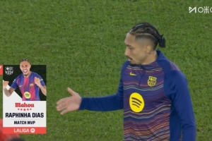 单刀球扳平比分!西甲官方:拉菲尼亚当选巴萨vs马竞全场MVP