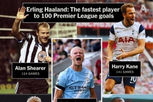 达成英超百球所用场次:哈兰德111场最少,阿兰·希勒124场第二少