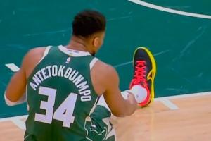 不妙!字母哥无对抗倒地+抚摸右小腿 表情不是很好
