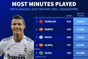 21世纪五大联赛非门将出场时间榜:C罗居首,拉莫斯、梅西前三