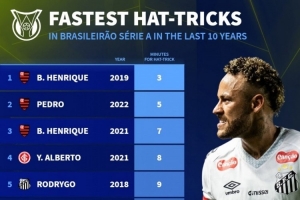 体育资讯12月5日讯 巴甲第37轮比赛,内马尔戴帽,帮助桑托斯3-0击败尤文图德。德国转会市场列出了巴甲近10年最快帽子戏法榜单,内马尔17分钟戴帽排名第8位。