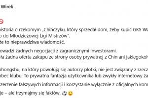 体育资讯12月05日讯 波兰业余俱乐部维雷克瓦韦尔发布官方公告,表示社交媒体上流传的中国投资者收购俱乐部一事为不实消息。