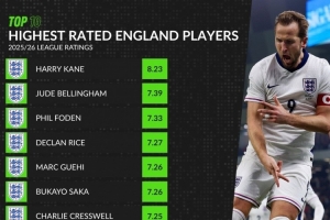 本赛季英格兰球员场均评分榜:凯恩8.23分居首,贝林、福登前三