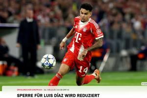 拜仁官方:迪亚斯禁赛上诉成功,欧冠禁赛由3场缩短至2场