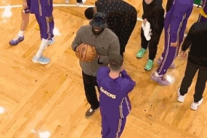 要不换衣服上场?暂停期间詹姆斯便装在场内拿着球 摩拳擦掌